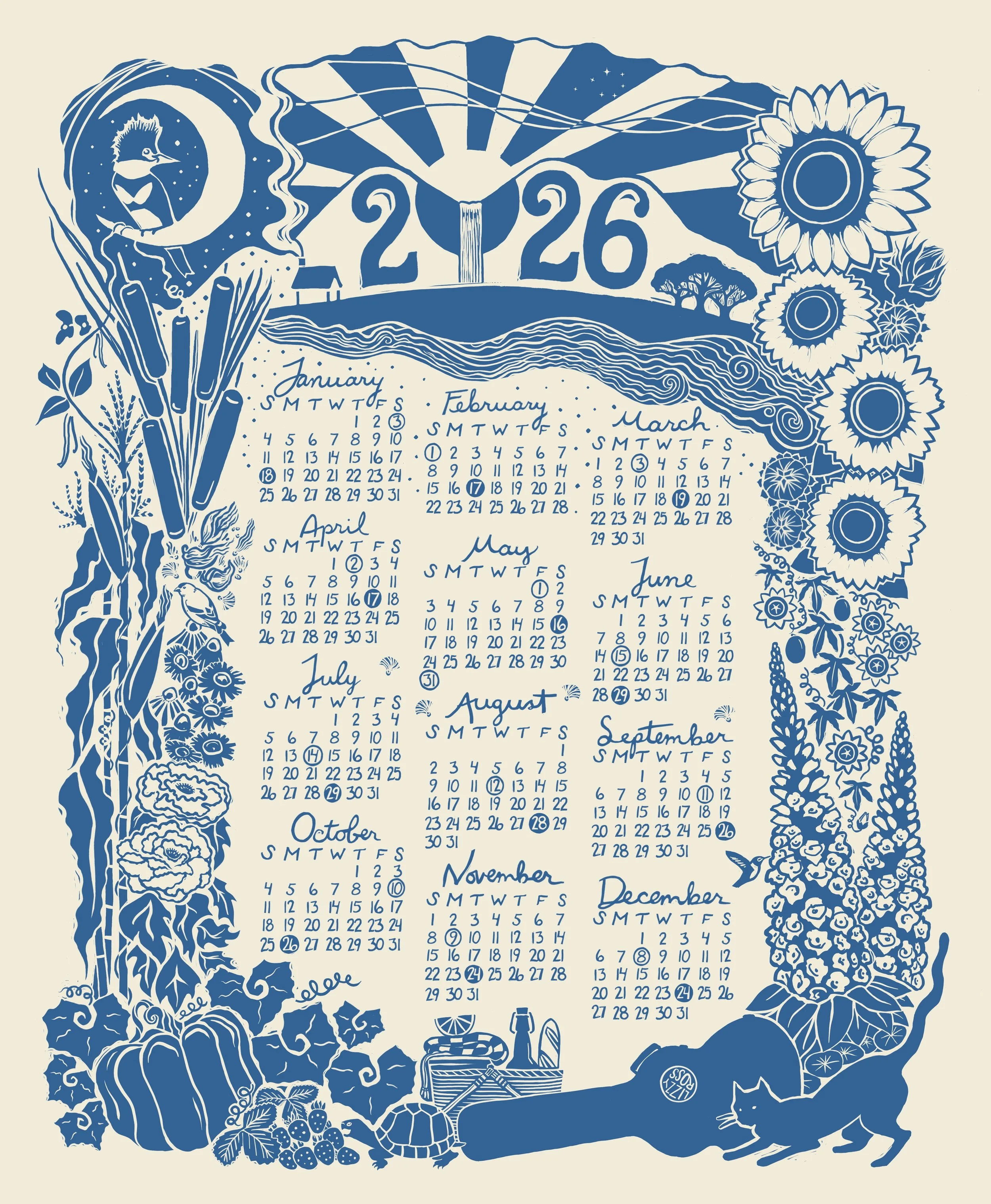 I hand-carve this calendar (backwards!) and hand-print each one on my Takach press.